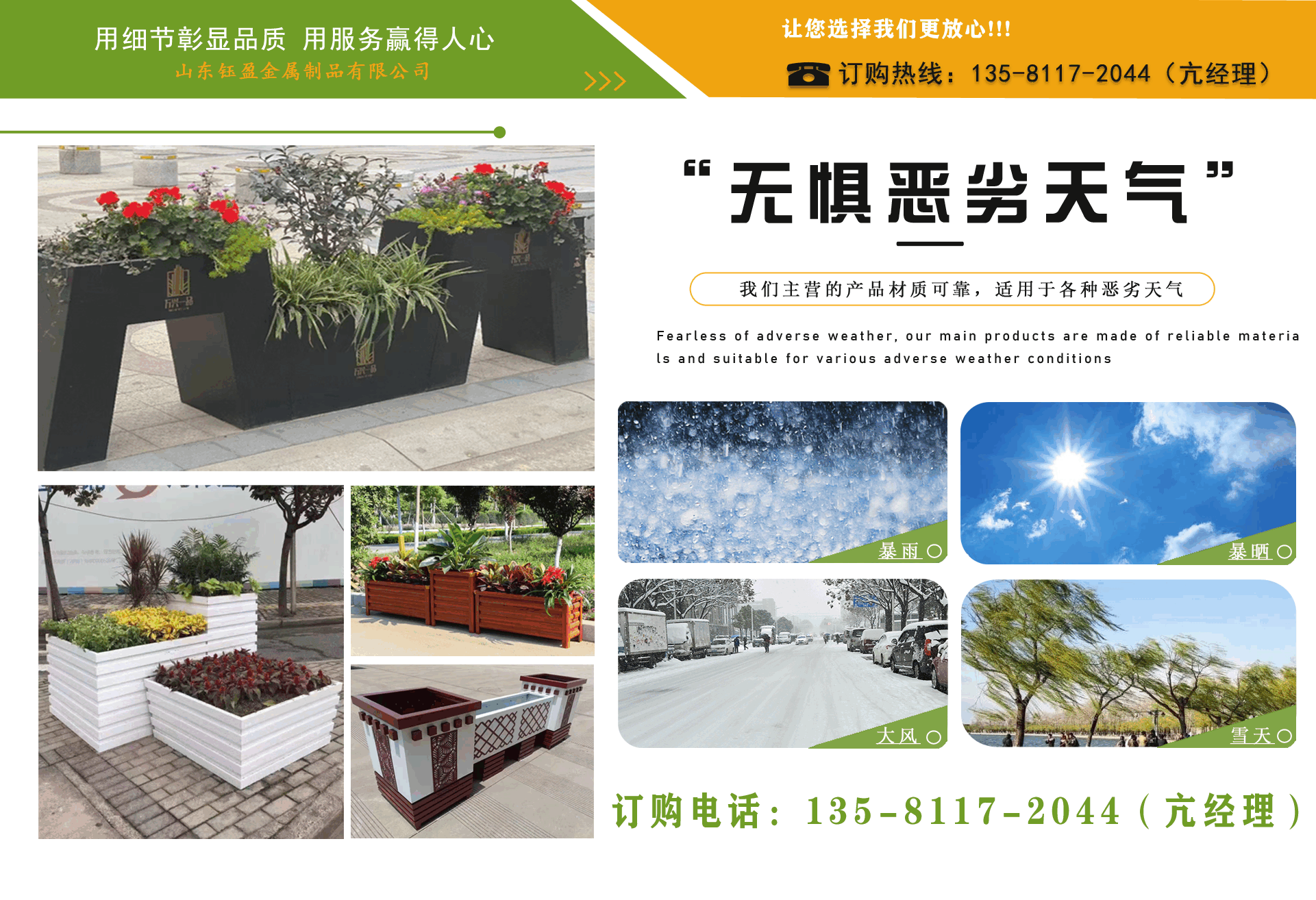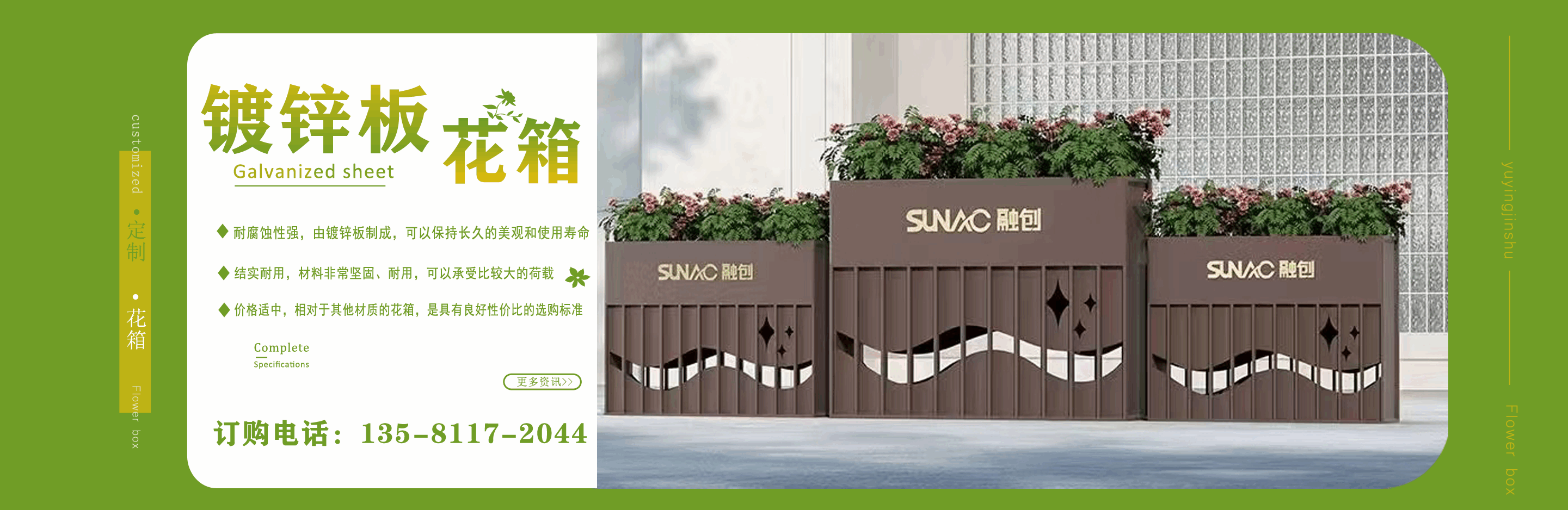 山東鈺盈金屬制品有限公司主營鍍鋅板花箱,道路隔斷花箱,定制花箱,戶外道路花箱,花箱座椅等產品,產品結構合理、性能優良,具有強度高、耐腐蝕、抗老化、隔熱隔音、節約能源、外形美觀、使用壽命長等優點,深受國內外客戶認可。  我們根據客戶所在城市的文化特征,制造出符合當地城市文化氣息的自然立體、觀賞性強的花箱產品成為城市里一道靚麗的風景線?! 」緦嵭姓\實、公正、守信、價格合理、平等互利?! 」緫{借雄厚經驗實力,恪守誠信為本的原則,得到了眾多客戶的信賴,并在業界獲得良好的口碑。建立了穩固的合作關系,隨著業務的不斷發展和壯大,合作伙伴的范圍也在不斷擴大。我們熱情盼望與您的合作,為社會的可持續發展獻上一份努力。...